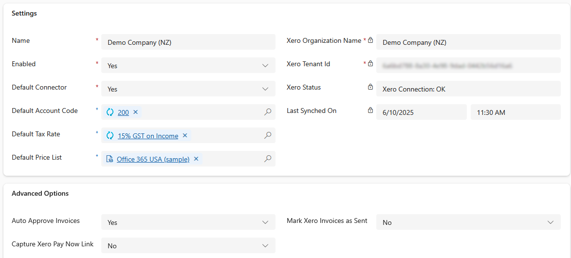 - Once the initial sync is complete, you can access your Xero Integration settings from the new Xero Connector model driven app. This allows you to configure system defaults such as the default price list, Xero account code, tax rate, and whether invoices should be approved by default when sent to Xero.