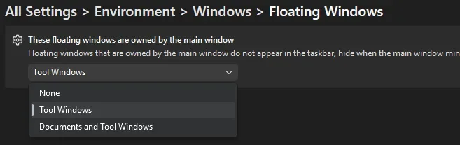 Each option controls how independent your floating windows are. None gives full independence with separate taskbar entries, Tool Windows keeps tool panels attached while documents float freely, and Documents and Tool Windows keeps everything tied to the main IDE. Choosing the right setup depends on how much flexibility you want across your workspace.
