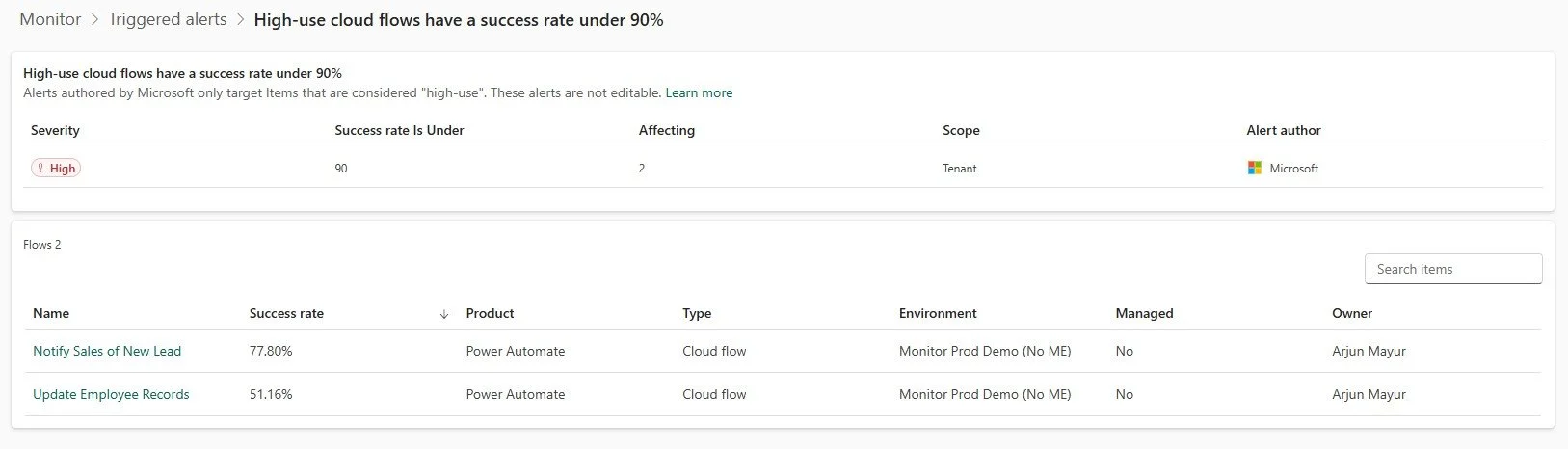 Microsoft now provides built-in alerts enabled by default for every tenant. These automatically flag high-use apps, flows, and agents when their health drops—no setup required.