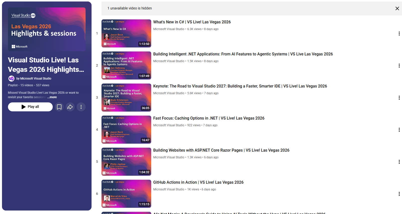 Microsoft has released 20 recorded sessions from VS Live! Las Vegas 2026, now available for on-demand viewing on the Visual Studio YouTube channel. The release gives developers who missed the event a chance to catch up on expert-led presentations at their convenience. Sessions are being rolled out in batches, making it easier for viewers to explore and revisit content over time.