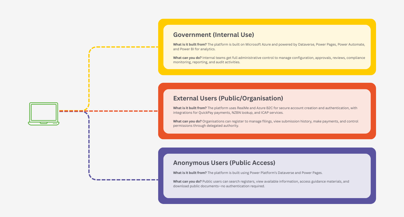 The platform is highly configurable and supports a wide range of registers including Small Legal Entities, Retirement Villages, Insolvency Practitioners, Auditors, Overseas Issuers, Climate Reporting Entities, Niue Companies, and Charitable Trust Boards.
